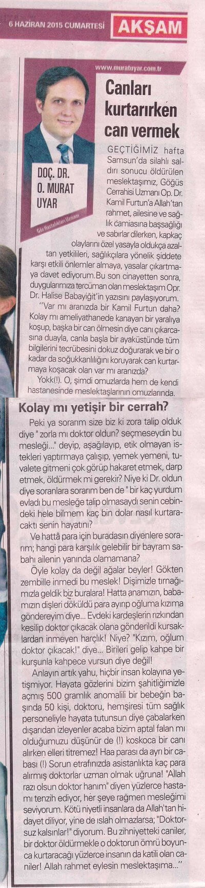 ‘’Var mı aranızda bir Kamil Furtun daha?! Kolay mı ameliyathanede kanayan bir yaralıya koşup, başka bir can ölmesin diye canı çıkarcasına duayla, canla başla bir ayak üstünde tüm bilgilerini tecrübesini dokuz doğurarak ve bir o kadar da soğukkanlılığını koruyarak can kurtarmaya koşacak olan var mı aranızda?